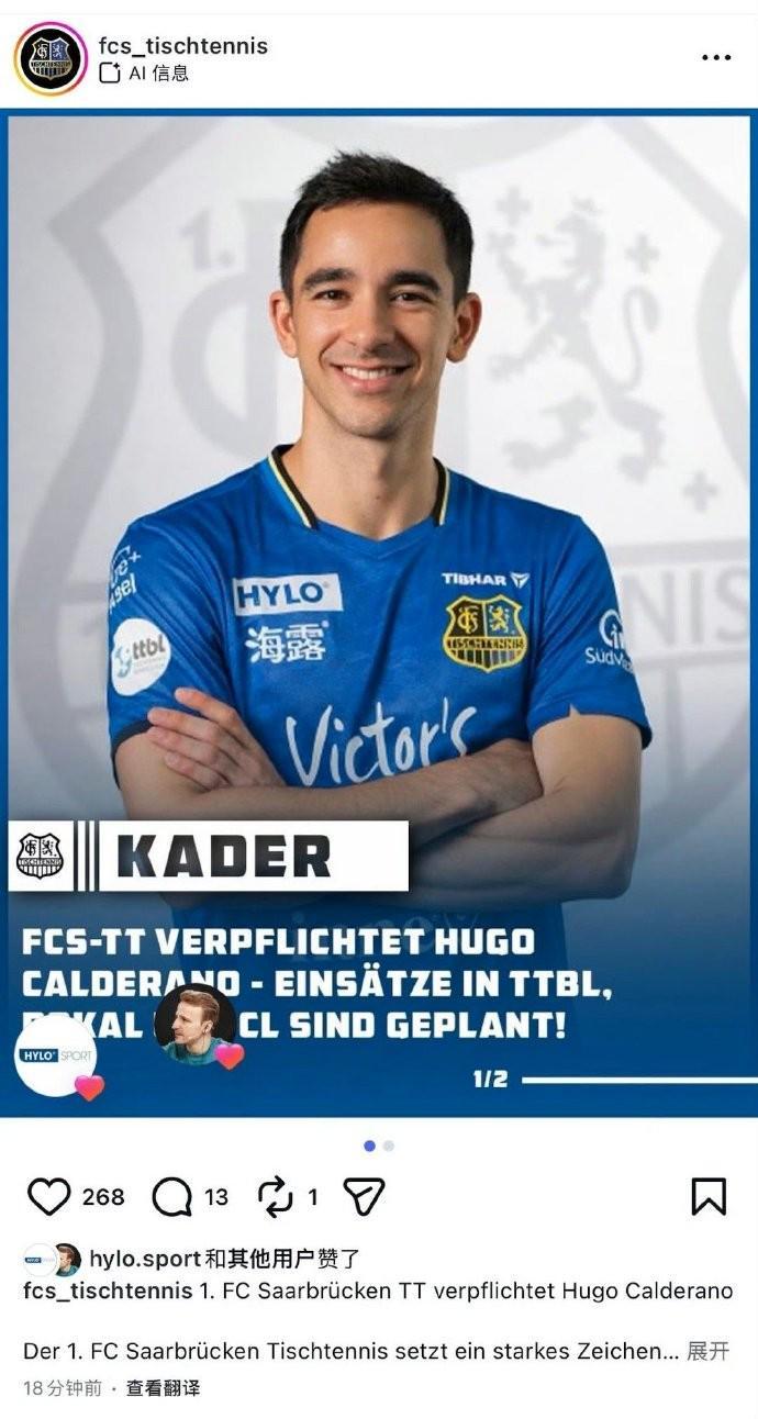 华体会官网-雨果加盟德甲萨尔布吕肯俱乐部,与樊振东成为队友